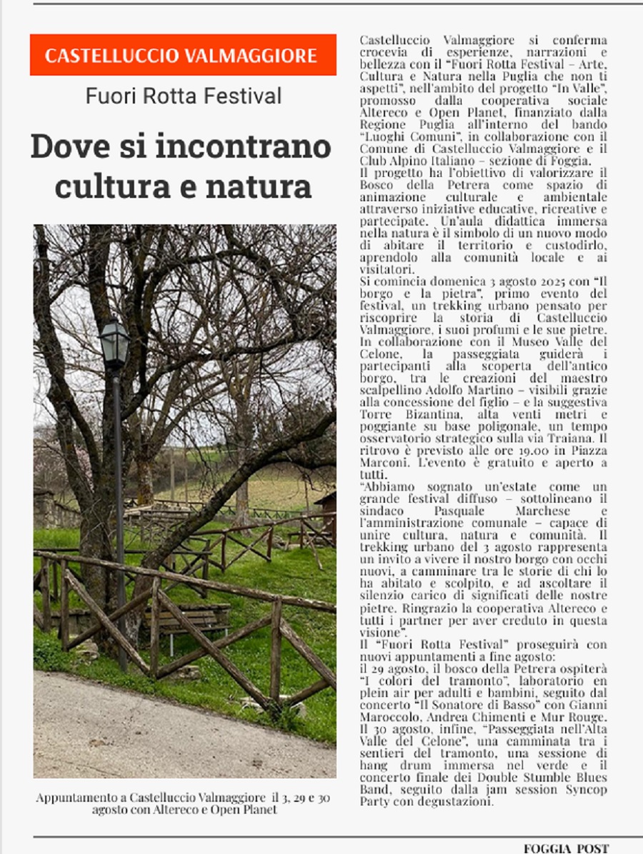 FoggiaPost 1 agosto 2025 Fuori Rotta Festival - CASTELLUCCIO VALMAGGIORE Dove si incontrano cultura e natura. ..leggi tutto |